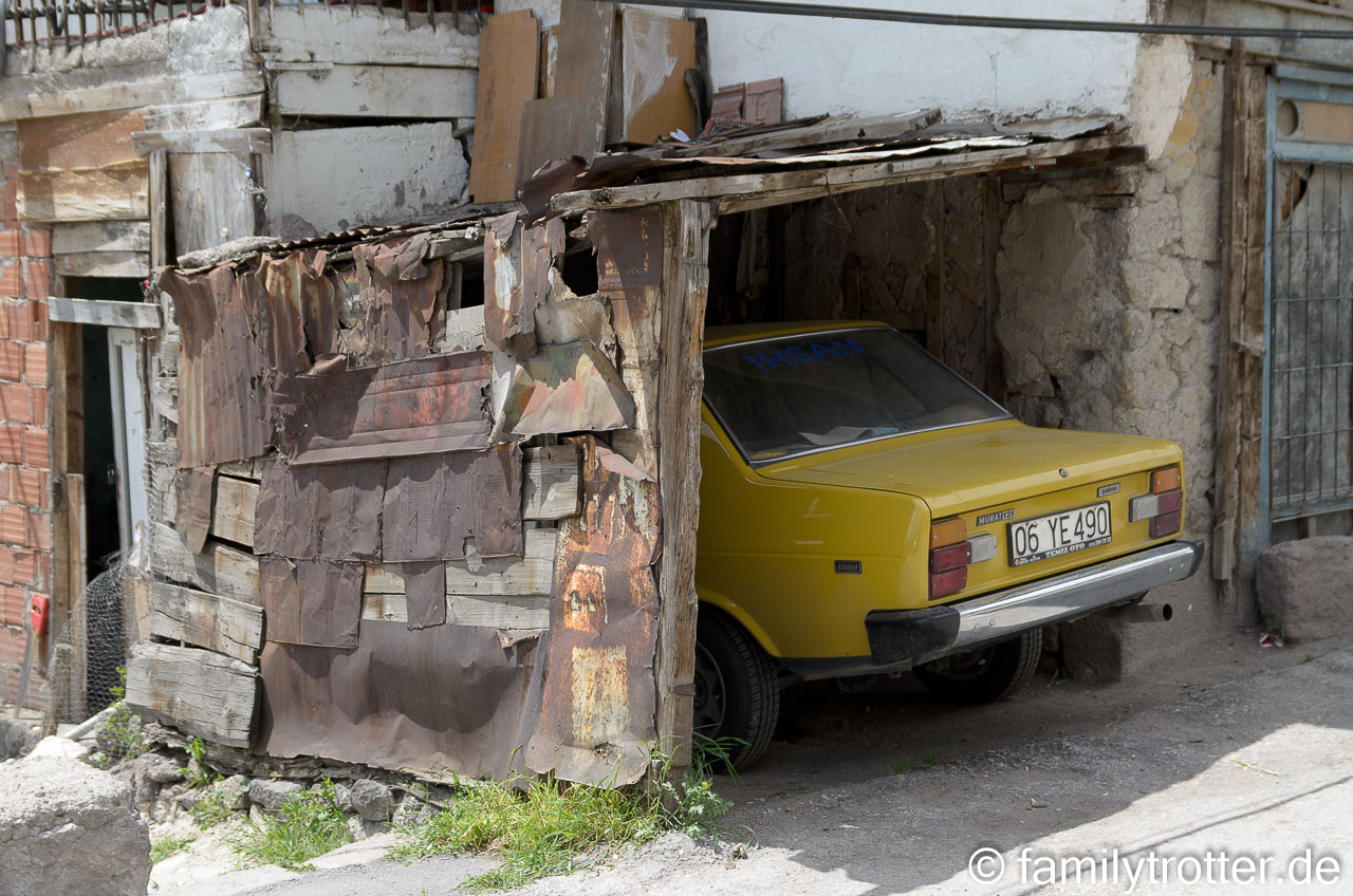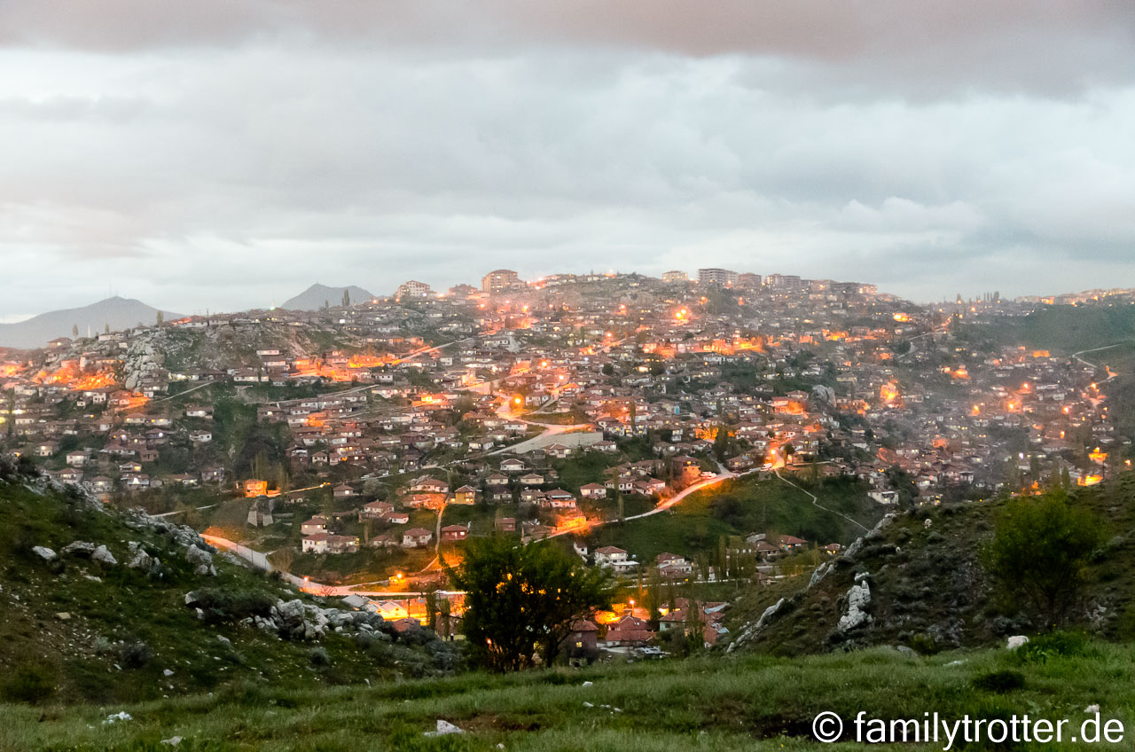 Zwangsweise lernen wir Ankara immer besser kennen. In einer Nebenstraße eines Armenviertels fahren wir uns nachts eine Schraube in den Reifen. Sofort wechseln wir den Reifen mit einem Gefühl der Unsicherheit. Ghettokids um uns. Wird hier noch etwas passieren? Es ist nichts passiert, doch nächsten Abend steuern wir im Stadtteil Ulus unseren nächsten Übernachtungsplatz an. Die Lage ist top. Wir haben einen wunderbaren Ausblick auf die Stadt und befinden uns unmittelbar an der Altstadt. Kurz darauf werden wir Zeugen einer Gewalttat. Wir beobachten über die Seitenspiegel wie drei Autos halten, aus denen Männer steigen, dann wird jemand zusammengeschlagen. Wir fahren langsam weiter. Ein Taxifahrer hält uns zwei Minuten später an und erklärt uns, dass wir dieses Viertel in der Dunkelheit besser nicht aufsuchen sollten. In den nächsten Tagen sehen wir viele Armenviertel, dicht an dicht zur Schickeria auf den Hauptstraßen. Mancherorts stehen riesige Laternen. Das sind ufoartige, großflächige Reflektoren in vielleicht 30 Metern Höhe, die von gewaltigen Strahlern darunter beleuchtet werden, so dass das Licht großflächig in jede noch so kleine Pore des Molochs strahlt. Eine Form der Kriminalitätsprävention? Auffällig und unangenehm ist die Präsenz vielfältiger privater Security, der Polizei (Polis), der Gendarmerie (Jandarma) und des Militärs, wenngleich alle sehr freundlich sind. (Doch auch nur weil wir hellhäutig und blond sind und nach Geld aussehen und das, obwohl wir ungepflegter erscheinen als manch Bettler. Doch langsam fängt auch hier die dünne Mittelschicht an, das enge Korsett alter Etiketten abzulegen. Hier tragen sogar Ziegenhirten Anzüge.) Selbst knapp außerhalb Ankaras patrouilliert die Polizei abends auf einsamen Feldwegen, fragt nach Ausweisen und weist freundlich darauf hin, zu unserer Sicherheit die Türen von innen zu verschließen. Dass wir hier irgendwo übernachten, ist nie ein Problem.