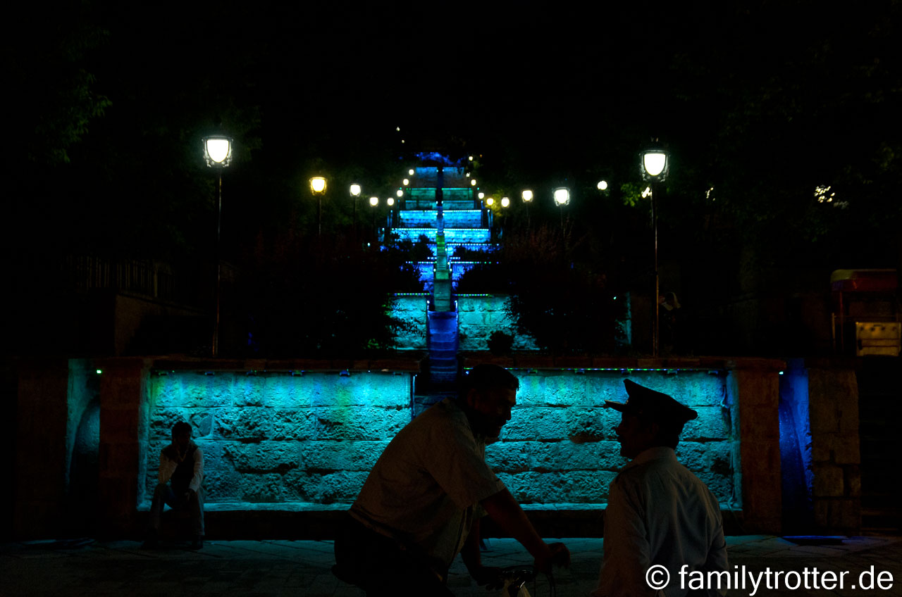 Bei unserer Ankunft in der Stadt sind wir froh einigermaßen schnell einen übernachtungs-fähigen Parkplatz direkt an der Straße (nicht der offizielle in den Park eingerückte Parkplatz!) zu finden, der am Nachtigallenpark drei Minuten zu Fuß vom Hascht-Behescht-Palast und zehn Minuten von einem der populärsten Orte des Iran entfernt liegt, dem Imam-Platz, eine weitere UNESCO-Welterbestätte. Noch am Abend machen wir uns auf den Weg durch den Nachtigallenpark zum Hascht Behescht. Alle Zugänge zum Park sind mit diesen Schikanen versehen. Von der Hitze, den Geschichten aber auch den Kindern sind unsere Hirne inzwischen so weich geklopft, dass unser erster Gedanke bleibt, dass diese Schikanen dazu dienen, eine kritische Masse – bei Protesten etwa – besser kontrollieren zu können. Auch die Zugänge anderer Orte, wo sich Menschen versammeln können, wie der Imam-Platz, sind damit verbaut. Erst viel später erwägen wir die viel harmlosere Erklärung, dass dies auch schlichtweg dazu dienen könnte, Mopeds und Derartiges von diesen Plätzen fernzuhalten.