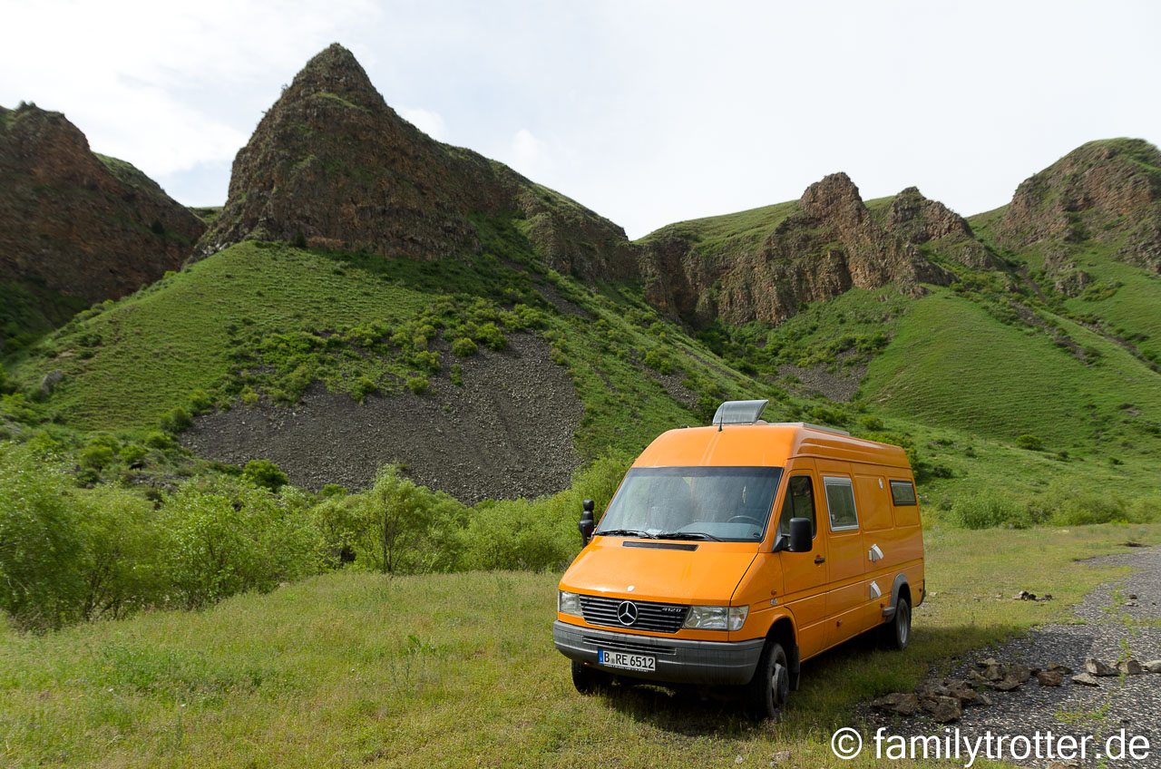 Erst als wir wieder auf die Passstraße stoßen, atmen wir auf und bedanken uns – für Westeuropäer – überschwänglich. Doch das Schneckentempo geht weiter. Dieselruß (neudeutsch: Feinstaub) liegt in der Luft. Wir sind inmitten gigantischer Berge, doch sehen nur soviel wie der Lichtkegel der Frontscheinwerfer hergibt – einen winzigen Ausschnitt. Die nächste Abbiegung ist unsere, bleiben direkt an der Straße mit Quellwasser stehen. Es liegen 452,5 iranische Kilometer hinter uns. Schluss! Aus! Feierabend!