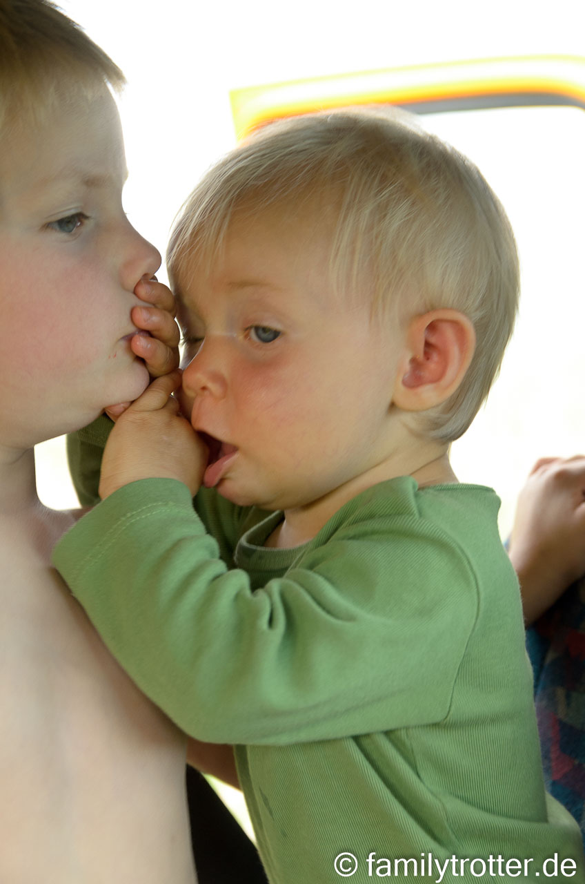 Die Autobahn ist zu unserer Überraschung mautpflichtig. Dummerweise ist uns der Rial ausgegangen, und Geld lässt sich häufig nur in größeren Städten wechseln. Doch an keiner der vier Mautstellen haben wir Probleme ohne zu zahlen durchzufahren. Unangenehm aber angemessen aus Respekt ist nur, dass wir vor jeder Mautstelle das Auto stehen lassen müssen, um vorher den Dienstleistenden unsere Situation zu schildern. In diesen 5 Minuten heizt sich der Fußboden vom Asphalt und dem laufenden Motor (Er sollte laufen, weil die Gefahr besteht, dass der Turbolader gerade bei diesen Temperaturen im Stand nach langen und schnellen Fahrten durchbrennt.) so stark auf, dass wir trotz Bodenisolierung weder barfuß treten noch auf ihm sitzen wollen. Und das ist jetzt nichts für Sicherheitsfanatiker, wie wir Deutschen es sind, sondern für Pragmatiker: Auf längeren Fahrten spielt Nikita mit Estha auch auf dem Fußboden. Ohne Abstriche bei der Sicherheit sind solche Distanzen mit einem einjährigen Kind nicht zu bewerkstelligen.