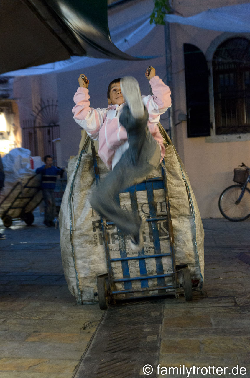 Wildes Treiben um uns herum. Viele Autos, Mopeds, Fahrräder, selbstgebaute Fahrräder mit Motoren, skurrile Fahrunterteile fahren an uns vorbei. Es fasziniert. Und es riecht nach Abenteuer. Erstmalig hören wir morgens den Muezzin – exotisch. Niklas saß fast den ganzen Tag am Netz und regelte alle Angelegenheiten für uns. Am Ende sollten wir nicht einmal etwas bezahlen. Danke, Fußball!