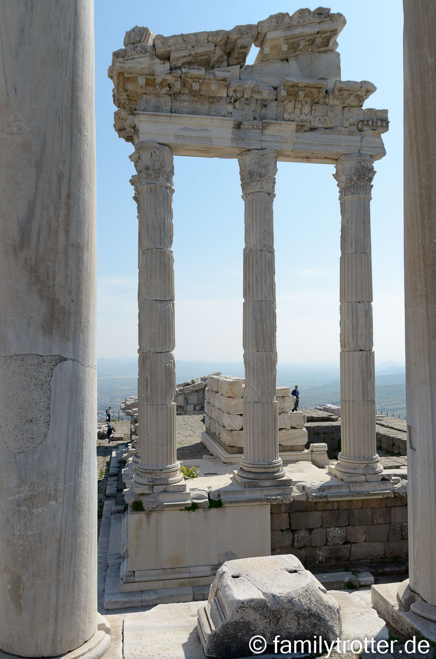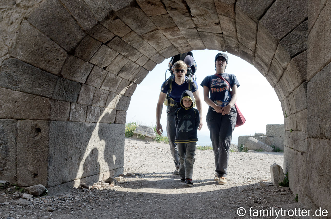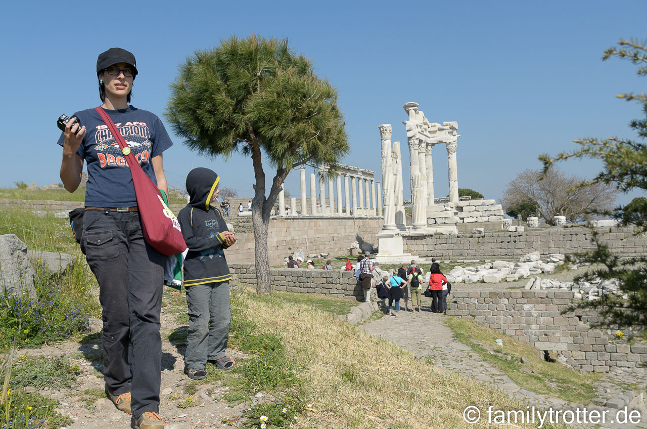 Weiter geht’s nach Bergama zur Akropolis von Pergamon. Es ist eine Enttäuschung. Wenig erhaltene und zusammenhängende Bauwerke präsentieren sich uns, dafür aber eine moderne Seilbahn und viel Eintrittsgeld. Es braucht viel Vorstellungskraft diesen Ort erwachen zu lassen, die einem Kind von 5 Jahren natürlich fehlt. Wir geben uns Mühe. Beim alten (und steilsten) Amphitheater der Antike steigen wir die vielen Treppen hinab und brüllen einmal nach ganz oben, wo jedes Wort erwartungsgemäß gut zu hören ist. Elias ist stark beeindruckt. Leider sind die Abendländer tollwütige Plünderer. So steht zum Beispiel der Zeus-Altar im im Pergamonmuseum in Berlin (Museumsinsel) und nicht hier in Pergamon. Im 19. und 20. Jahrhundert wurde eine riesige Kulturausbeute betrieben. Für eingefleischte Romantoriker wahrscheinlich trotzdem ein Muss. Wieder unten im Dorf (Bergama) versucht uns ein kleiner Junge händeringend in sein Restaurant zu überreden. Der Junge, vielleicht 13 Jahre alt, serviert uns mannhaft das Essen und kneift, wie die Alten, Estha in die Wange. Abends fahren wir weiter nach Izmir, der drittgrößten Stadt der Türkei, und schlafen am Meer etwas außerhalb der Stadt.